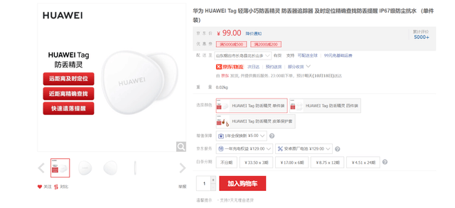 此商品目前在京东活动售价99元,属于近期好价,华为防丢精灵的体型非常小巧便携,跟我们平常用的门禁卡差不多大小。体型薄至5.6mm,轻至6g,放入钱包、卡包等随身小包中非常轻松,使得便携携带无负担。并且能够实现远距离定位、近距离精确查找、遗落提醒等功能。还拥有IP67级别防尘抗水。喜欢的朋友不要错过。