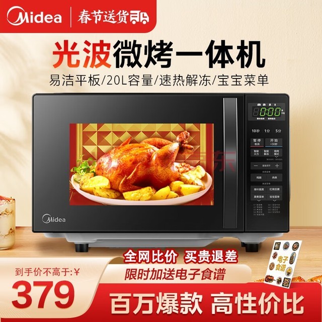 最后我们来看看美的微波炉烤箱一体机。这款微波炉以20升的大容量和平板式设计为一大亮点,适用于各种加热和解冻场景。同时,它还具备高效的速热和解冻能力,能在短时间内将食物加热至合适状态。此外,该微波炉还支持多种烹饪模式,如烤肉、烤蛋挞等各种美食制作方法。即使在家里也能品尝到美妙佳肴的朋友,不妨尝试一下这款美的微波炉。