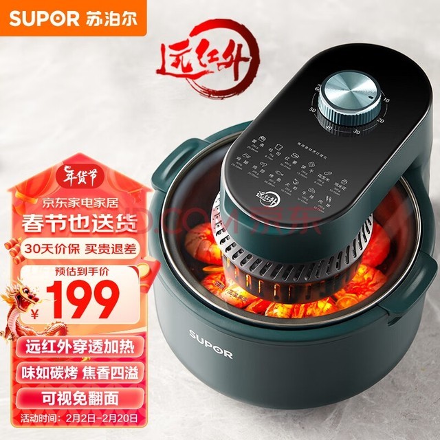 首先是来自于国内知名品牌的苏泊尔的KJ40D850空气炸锅。此款产品搭载了强大的5000mAh电池,使其拥有出色的续航表现;并且配备有环形可视天窗设计,使你在烹饪的过程中能实时观察到食物的状态变化。除此之外,其4升的大容量设计能满足日常生活中的多种需求。如果追求多样化的菜品制作及保留原有口感与营养价值的话,这款空气炸锅无疑是理想之选。